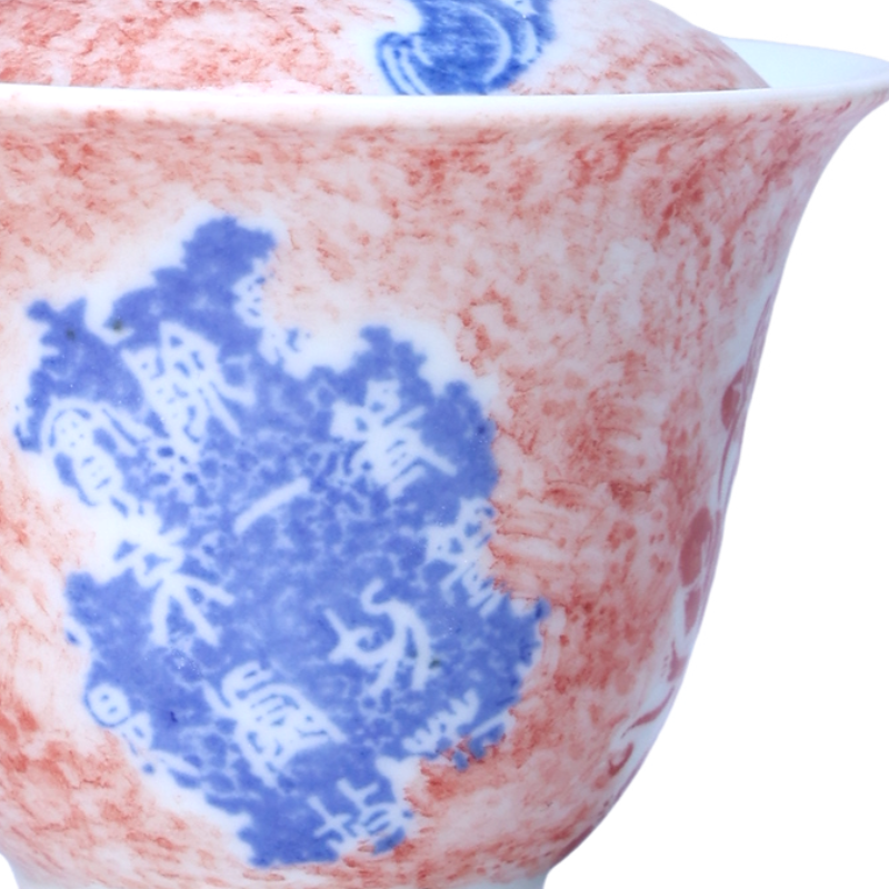 Handcrafted Dunhuang Feitian gaiwan tea set in blue and white porcelain with glaze red details—an artistic Chinese tea set inspired by ancient murals and calligraphy