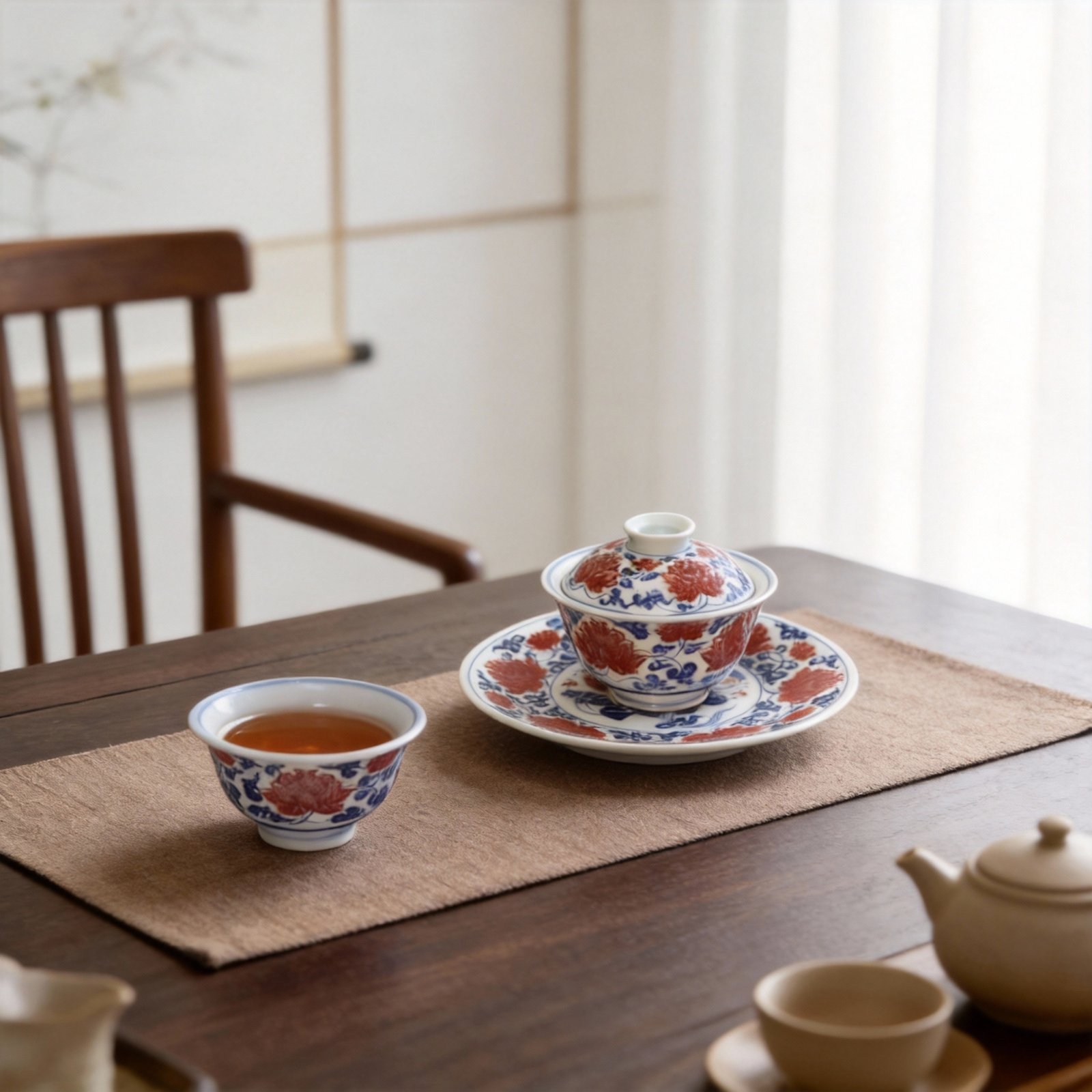 Handcrafted peony blue and white gaiwan tea set with red blossom details—an elegant Chinese tea set symbolizing prosperity and timeless craftsmanship.
