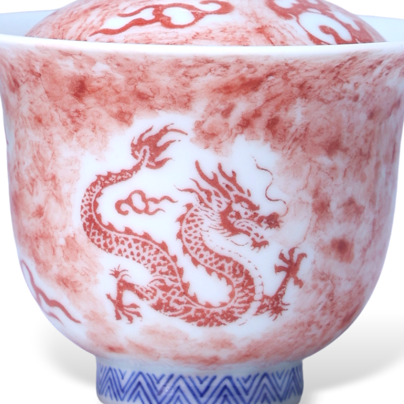 Handcrafted Dunhuang Flying Dragon gaiwan tea set featuring blue and red porcelain with dragon totems—an artistic Chinese tea set celebrating heritage, power, and tradition.
