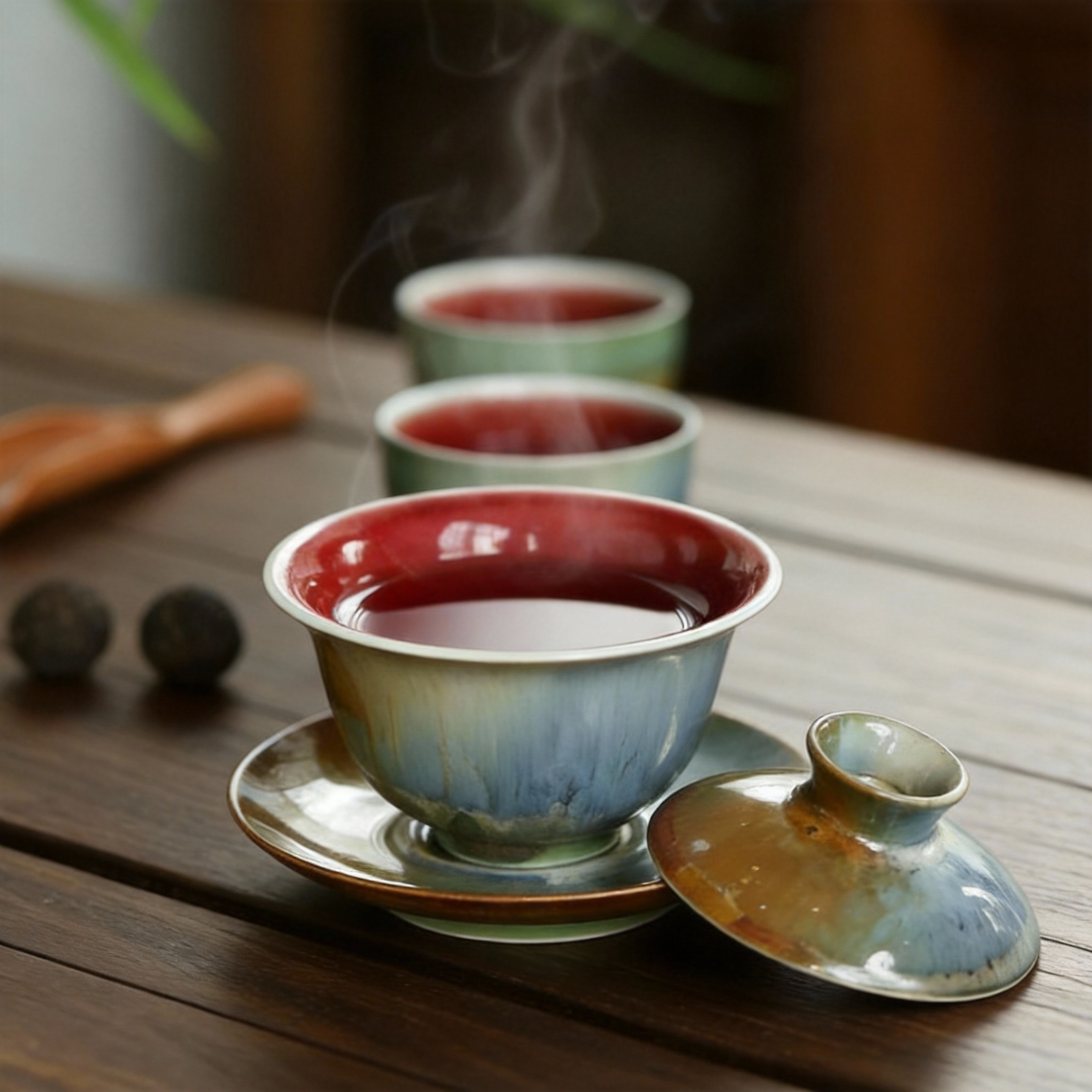 This set featuring unique gradient green kiln-fired glaze exterior and elegant deep red interior. A distinctive piece for refined tea rituals.