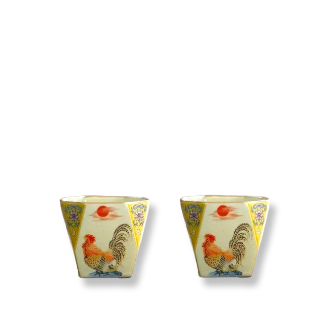 This heat-resistant, scald-proof Ru Kiln ceramic octagonal teacup features a smooth white interior, an off-white exterior with yellow border accents, and hand-painted vintage rooster and red sun motifs, making it ideal for Gongfu tea ceremonies.