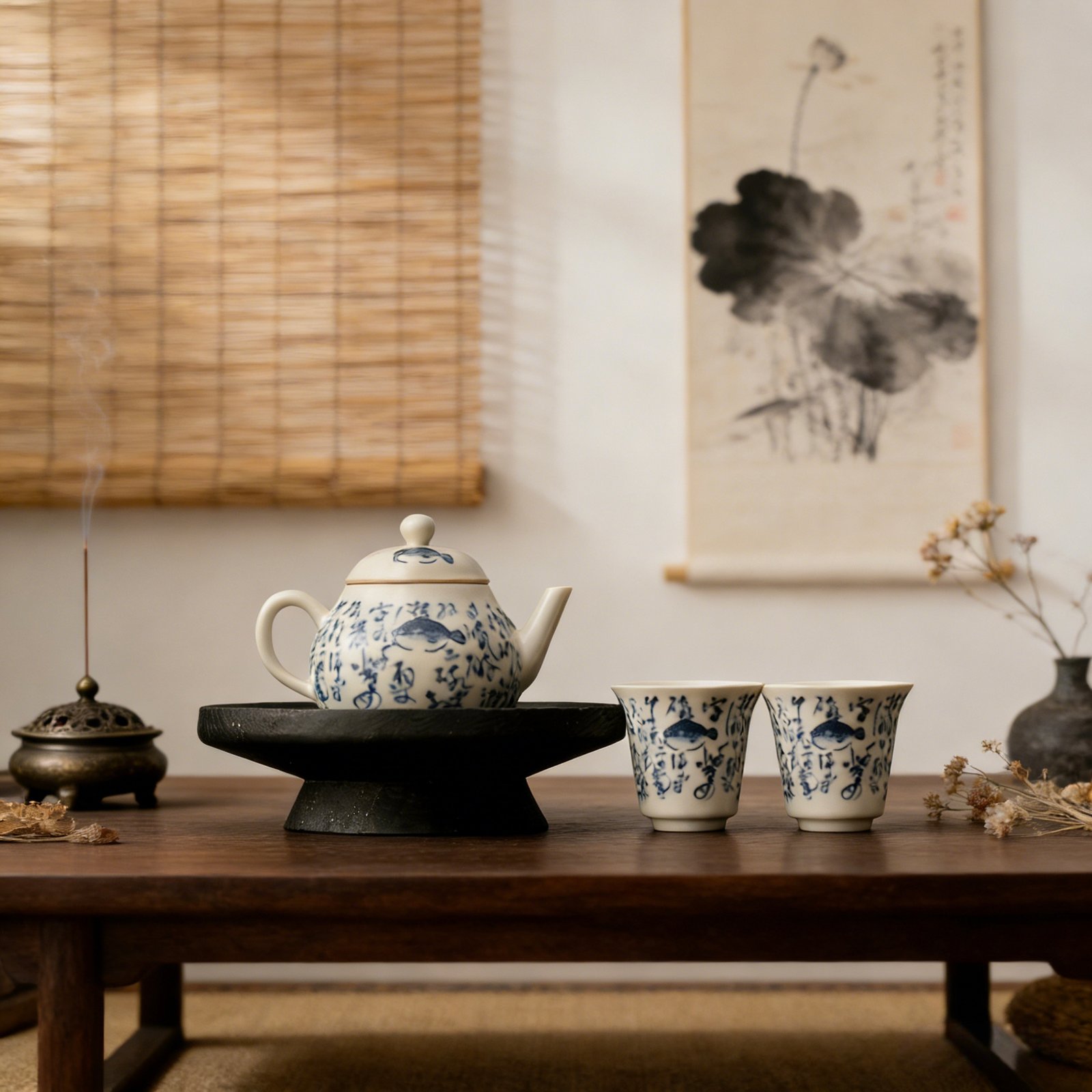 Poetry Blue and White Porcelain Kung Fu Tea Set, soda-glazed with retro crackle finish. Includes 1 teapot, 1 tray, 2 cups, featuring lucky fish & Chinese poems, ideal for solo tea time.