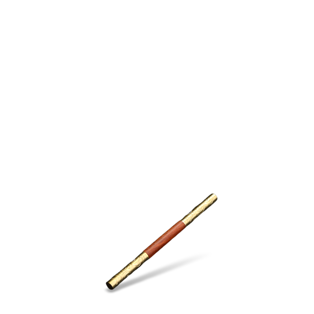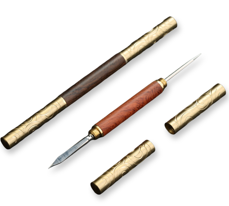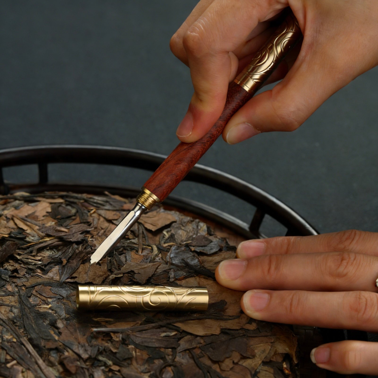 Kung Fu Tea Double-Ended Tea Knife, 2-in-1 tea tool for puer cakes. Copper, wood & steel with cloud pattern, removable caps. Rosewood/ebony handle, compact and durable for daily tea use.