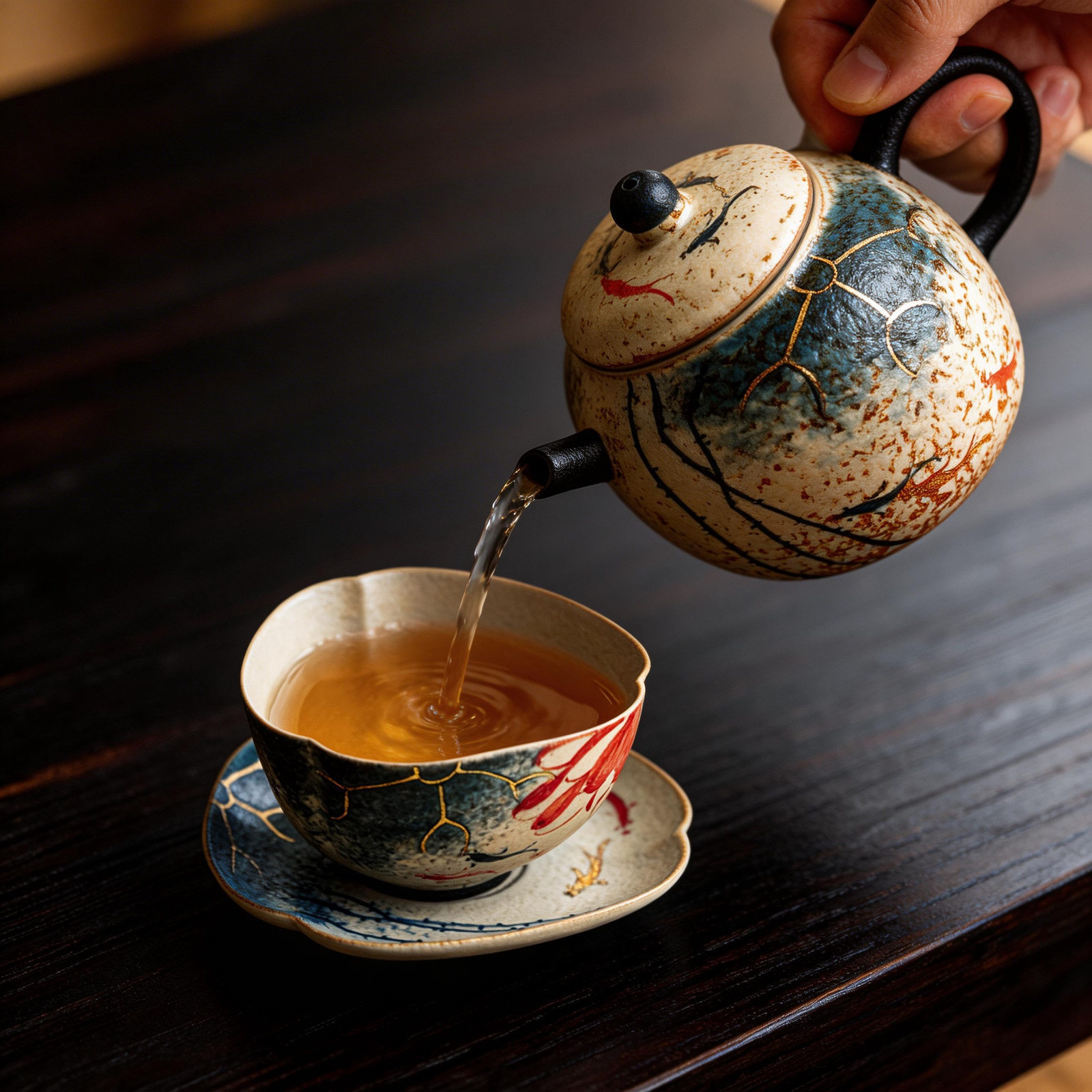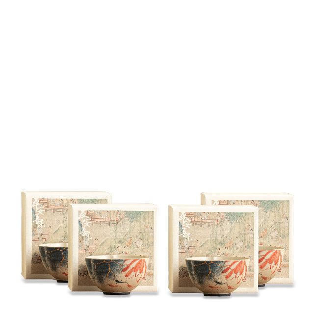 Rustic color glaze, hand-painted ink art with vivid koi and aquatic patterns. Gold outlines add elegance. Comes in a gift box, ideal for kung fu tea and gifting.
