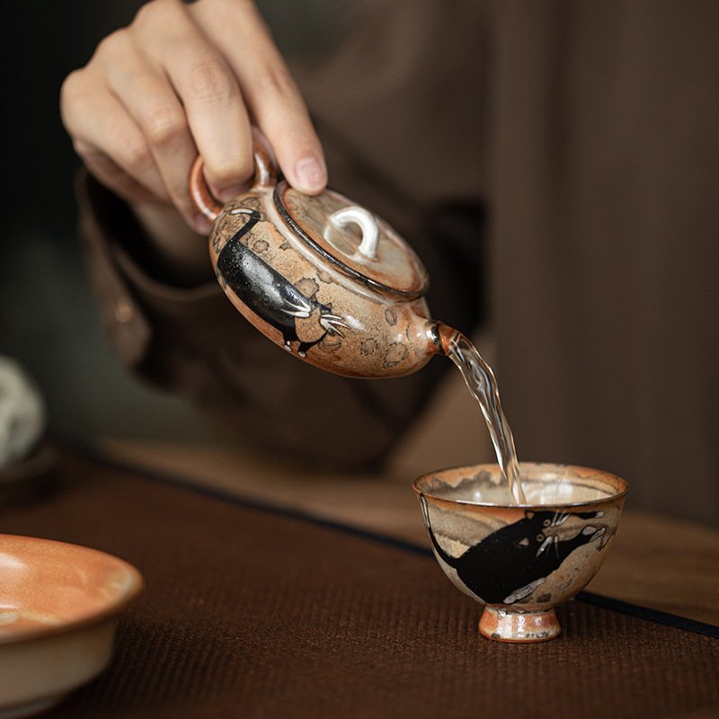 Handmade ceramic with unique crackle glaze. Playful black cat art brings luck. Silver-gilded bridge lid, ideal for kung fu tea.